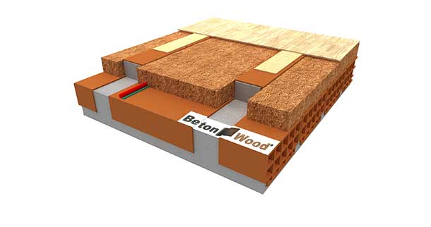 Sistema per solaio caratterizzato da pannelli accoppiati in fibra di legno e cementolegno tipo BetonWood tassellati BetonFiber, autolivellante e pavimento.![]()